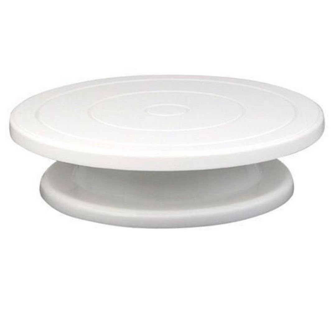 A bailarina giratória de 27,5 cm é feita de plástico resistente e possui rolamentos que permitem uma rotação suave, facilitando o nivelamento, a aplicação de cobertura e a criação de detalhes decorativos.