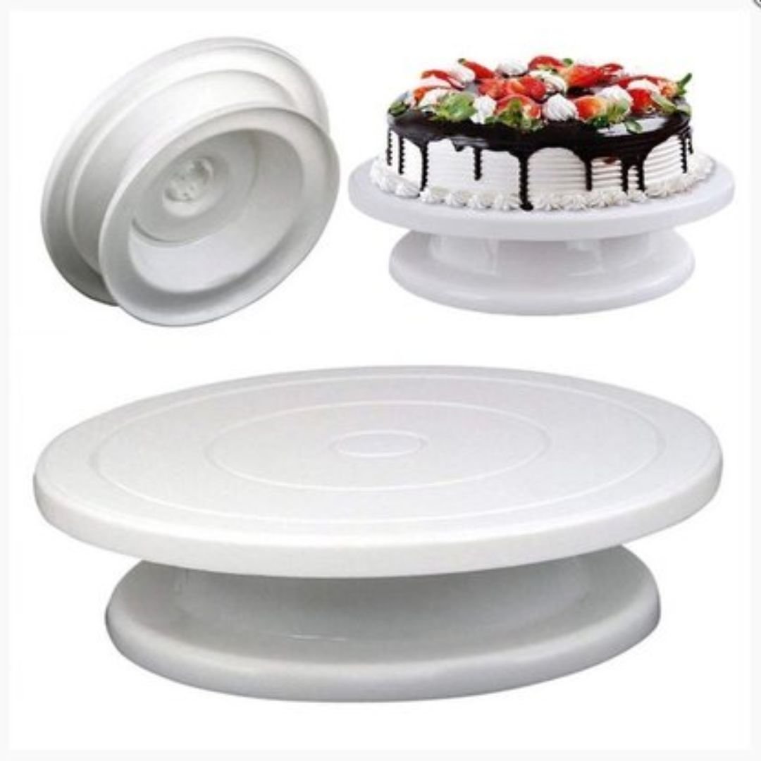 Para usar, coloque o bolo sobre a base e gire-a suavemente, garantindo uma decoração homogênea e profissional com facilidade.