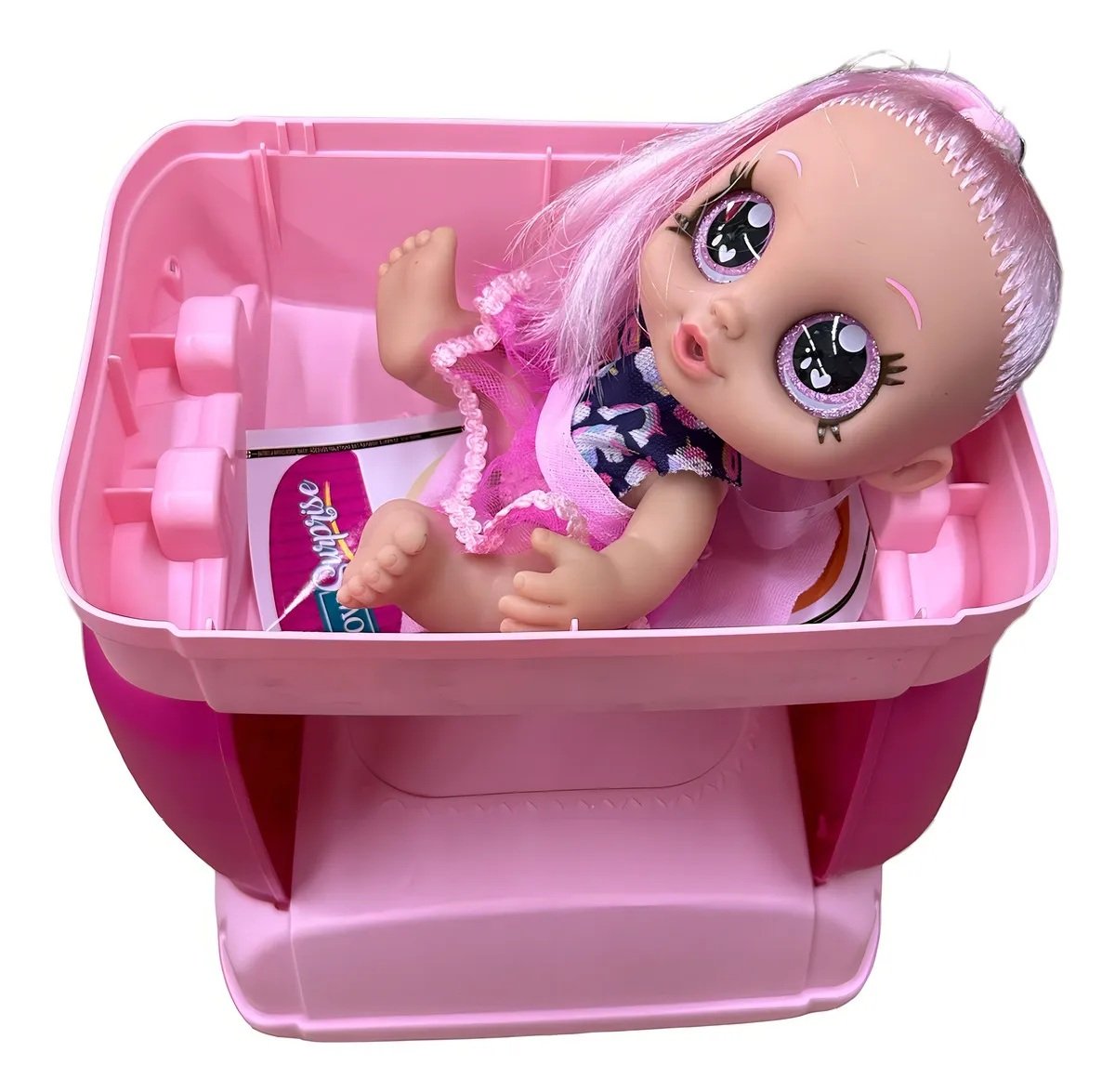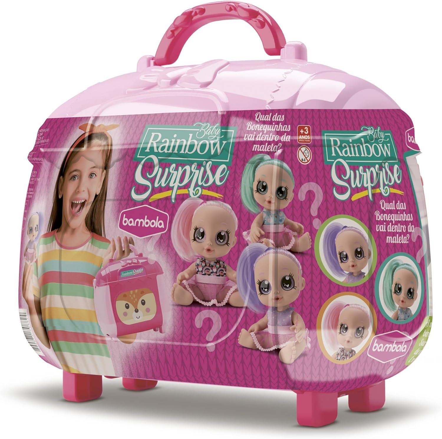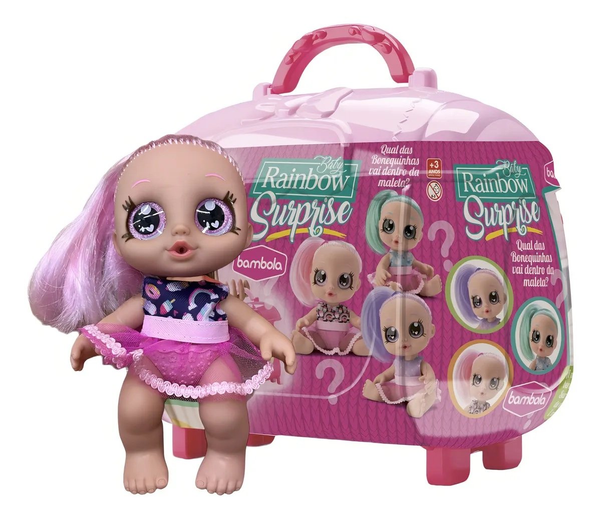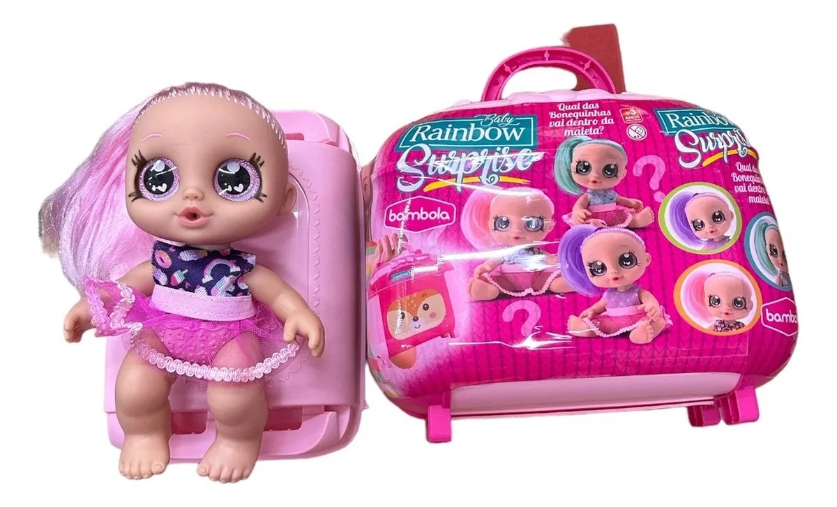 A maletinha se transforma em um bercinho para você colocar a Rainbow Surprise para dormir, e vira maletinha de novo para você passear com ela. Qua bonequinha vai dentro da Maleta? É uma surpresa! Colecione!