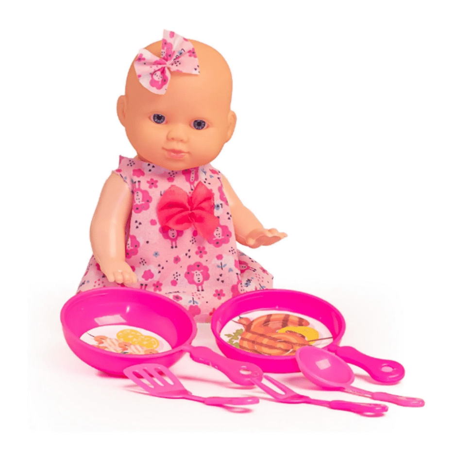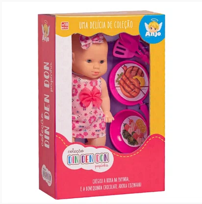 Uma linda e divertida coleção, essa é a coleção Din Den Don. Uma linda bonequinha com vestidinho e laço na cabeça. Na versão Papinha, acompanha frigideira, panela e utensílios de cozinha, para a criança brincar de fazer papinha não só para a Din Den Don, mas para todas as suas bonecas.