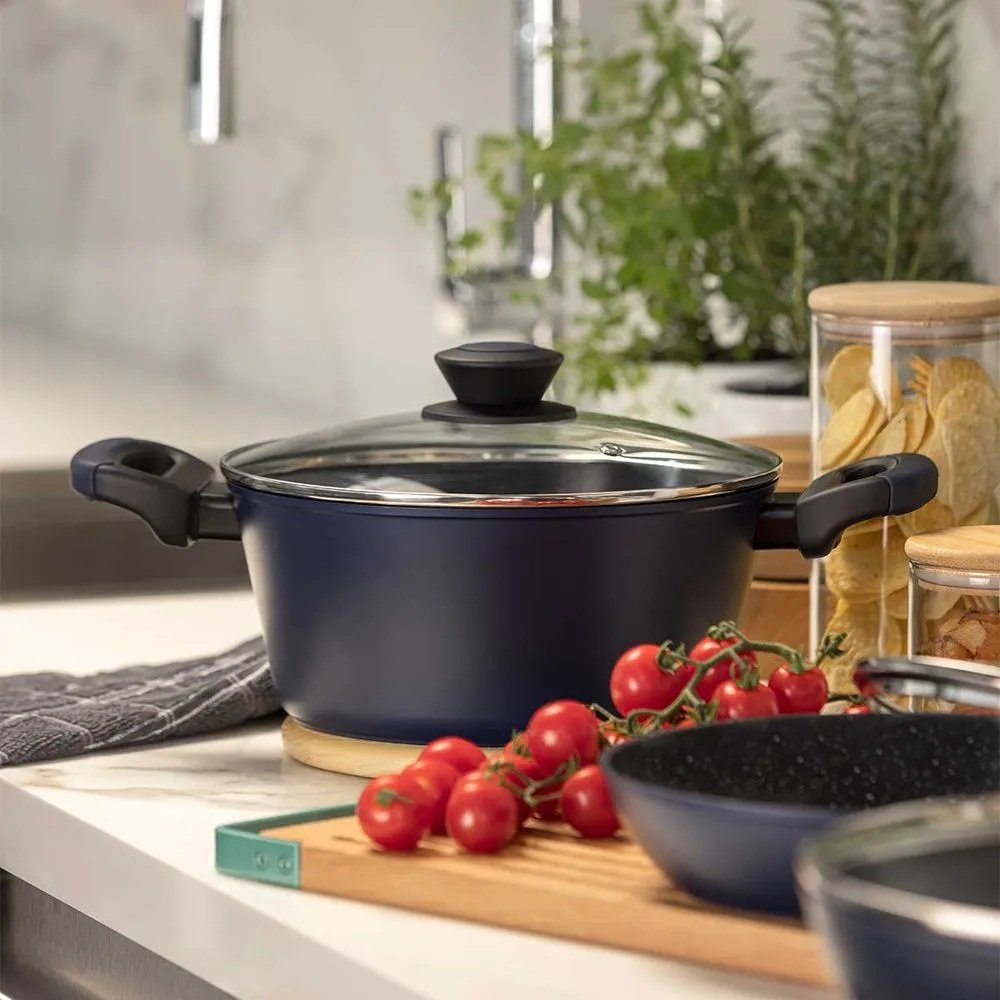 A caçarola é feita de alumínio forjado com 3 mm de espessura e 3,5 mm de espessura no fundo, o que as torna leves e proporciona melhor distribuição de calor. Suas alças possuem revestimento soft touch, oferecendo mais segurança e conforto durante o manuseio. A linha é compatível com todos os tipos de fogão, incluindo indução, o que traz mais segurança e economia à sua rotina.