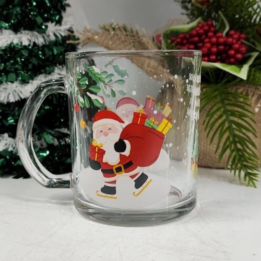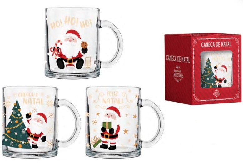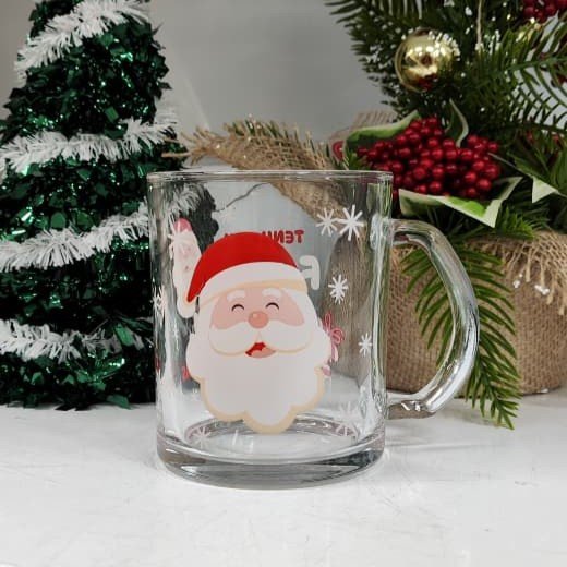 Feita em vidro transparente de alta qualidade, a caneca traz estampas divertidas e coloridas do Papai Noel em estilo cartoon, que encantam adultos e crianças. Ideal para presentear, decorar a mesa da ceia ou tornar seus momentos de inverno ainda mais aconchegantes.