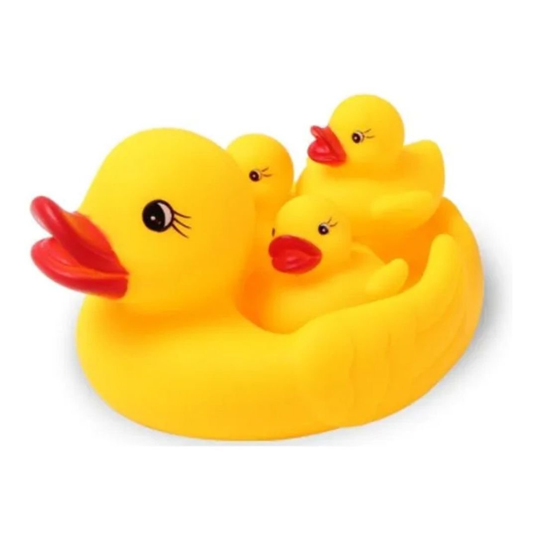 Kit com 4 patinhos de borracha, sendo mãe e os 3 filhotes. Flutuam na água e fazem o som ao aperta-los.