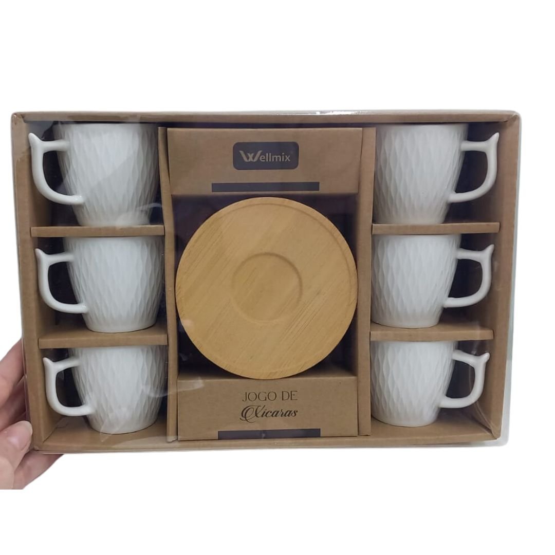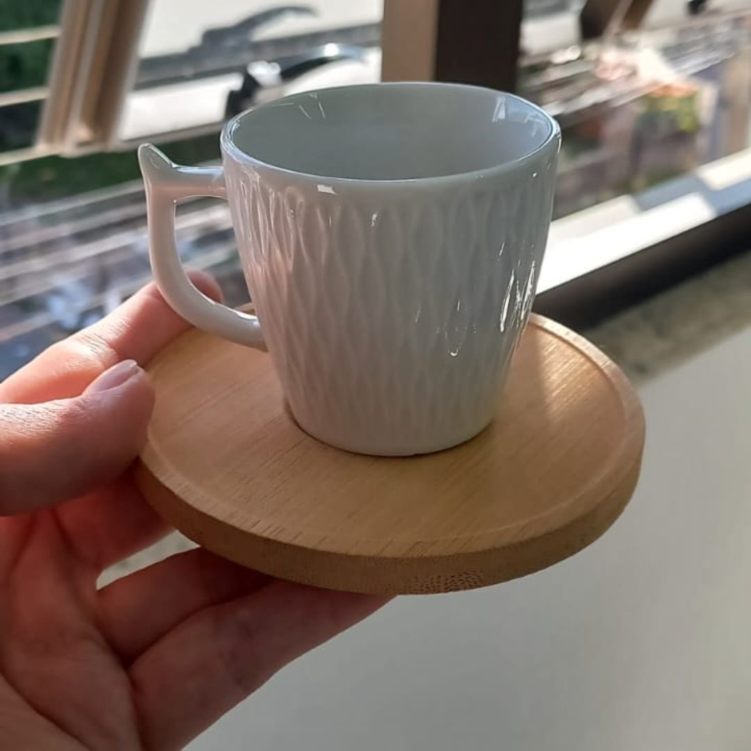 Caixa acompanha 6 xícaras de cerâmica 90ml medindo 5,5 x 7,5cm e 6 pires de bambu