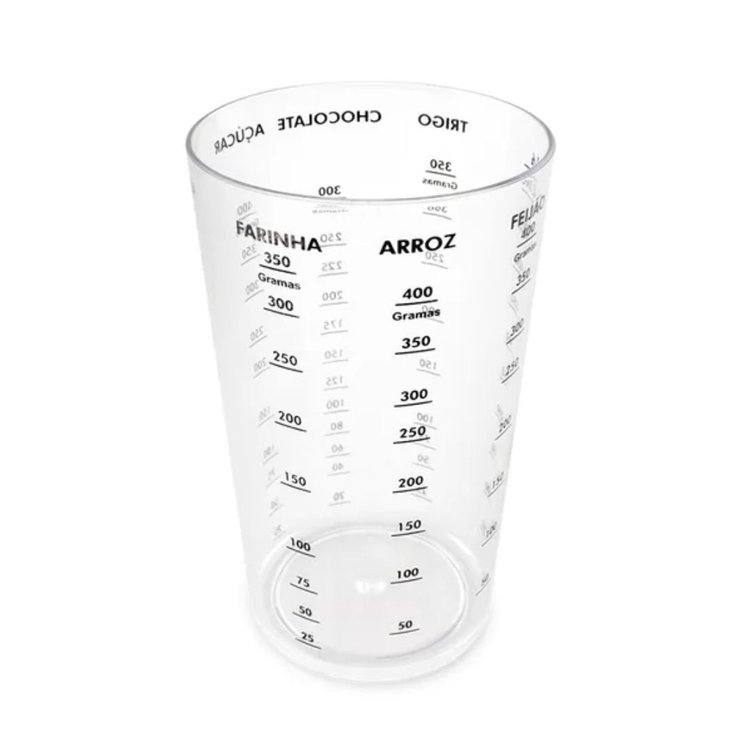 Contém medidas para arroz, farinha, açúcar, feijão e outros alimentos.
