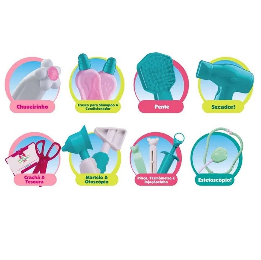 Contém na maleta: 01 cachorrinho + 15 acessórios, são eles: 01 Crachá, 01 Tesoura, 01 Martelo, 01 Otoscópio, 01 Pinça, 01 Termômetro, 01 Injeçãozinha, 01 Estetoscópio, 01 Chuveirinho, 02 Frasco (Shampoo e Condicionador), 01 Pente, 01 Secador, 01 Prateleira para acoplar na maleta (2 peças), 01 Tampo para o ralo do lavatório.