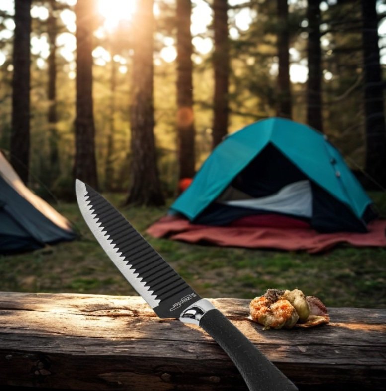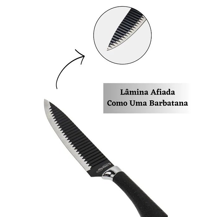 Sua lâmina em aço inoxidável com tratamento térmico total garante um fio resistente e durável. O diferencial está no revestimento antiaderente com pintura eletrostática, que evita que alimentos grudem durante o corte – perfeita para sushi, carnes, peixes e legumes. Chega de faca suja e ingredientes colando!