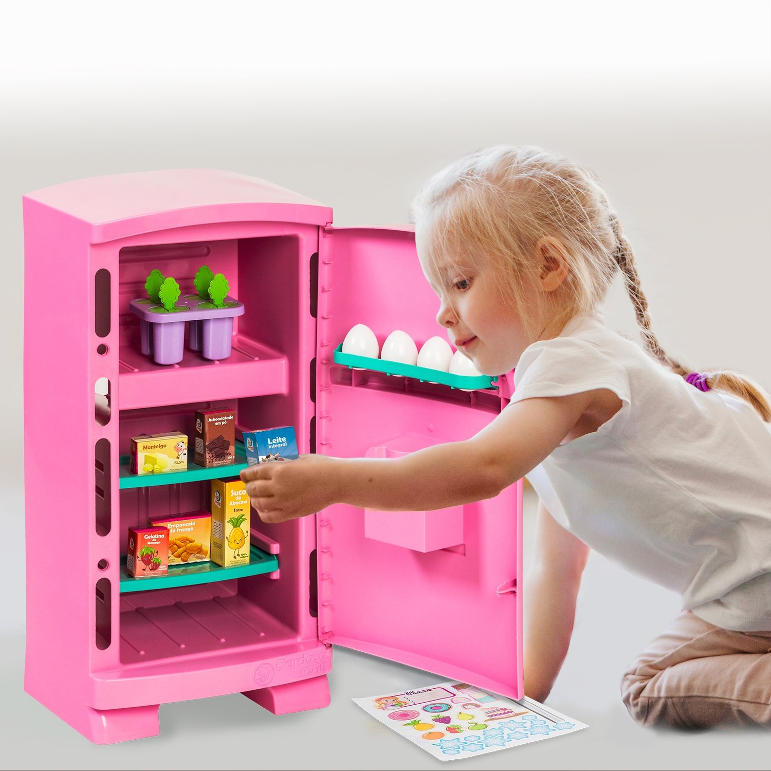 Essa linda geladeira tem um tamanho grande e encorpado. Com 50 cm de altura, e diversos acessórios para brincar, ela tem um dispenser lúdico na porta, prateleiras internas, porta-ovos com 4 ovos, fôrma para fazer picolé, cartela de adesivos e caixinhas para recortar e montar que tornam a brincadeira ainda mais lúdica e divertida! Os pequenos poderão brincar de forma criativa e segura, com sua própria geladeira igual a da mamãe!