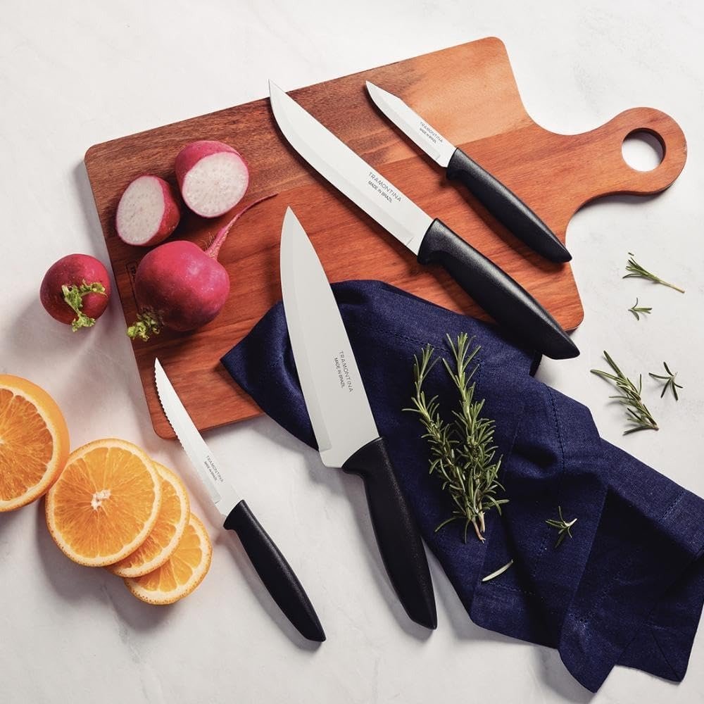 O jogo de facas Tramontina Plenus com lâminas em aço inox e cabos de polipropileno preto 4 peças será seu ajudante perfeito na hora de preparar suas refeições, sejam elas com carnes, legumes ou frutas. Perfeito para uso diário, ele é composto por facas desenvolvidas com lâminas em aço inox com tratamento térmico e devido a isso, garantem um excelente fio de corte. Os cabos são em polipropileno na cor preta, são resistentes e duráveis, podendo ainda, ir à máquina de lavar louças. Escolha Tramontina e deixe seu dia a dia na cozinha muito mais prático!