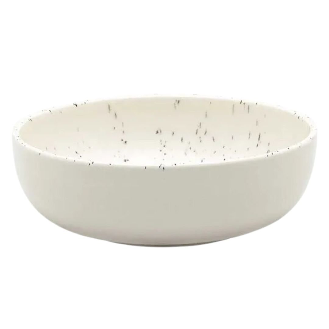 Tigela Flat Cerâmica 600ml: Com formas retas e funcionais, a tigela é fácil de armazenar até mesmo em armários mais compactos. Com inspiração na natureza, a decoração Chuvisco possui acabamento brilhante com base off white e pequenos detalhes em preto, que imitam gotas de chuva. Nesta opção a tigela com capacidade para 600 ml