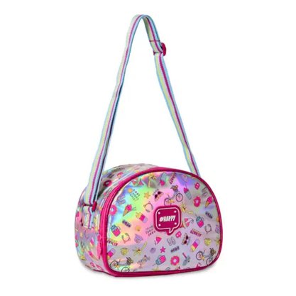 Características: Possui alça listrada tiracolo regulável. Formato arredondado. Estampa e feito holográfico. Revestimento térmico.