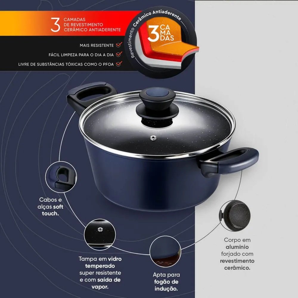 A panela é feita de alumínio forjado com 3 mm de espessura e 3,5 mm de espessura no fundo, o que as torna leves e proporciona melhor distribuição de calor. Seus cabos possuem revestimento soft touch, oferecendo mais segurança e conforto durante o manuseio. A linha é compatível com todos os tipos de fogão, incluindo indução, o que traz mais segurança e economia à sua rotina.