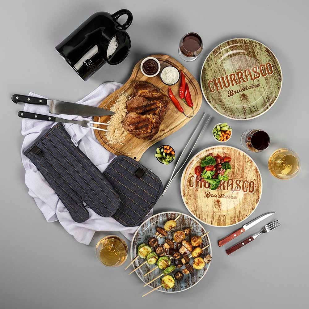 A fama do churrasco brasileiro já ganhou o mundo. Apesar de ser mais tradicional no Sul, o prato aos poucos foi se espalhando por todas as regiões e até mesmo expandindo fronteiras. Para servir um autêntico churrasco brasileiro, a Oxford apresenta uma decoração especial para esse prato tão cativo dos brasileiros. O Prato Churrasco Yellow é decorado com textura de madeira e tons bem brasileiros.