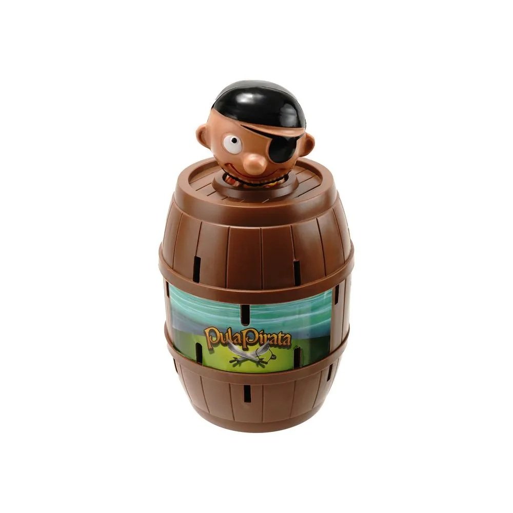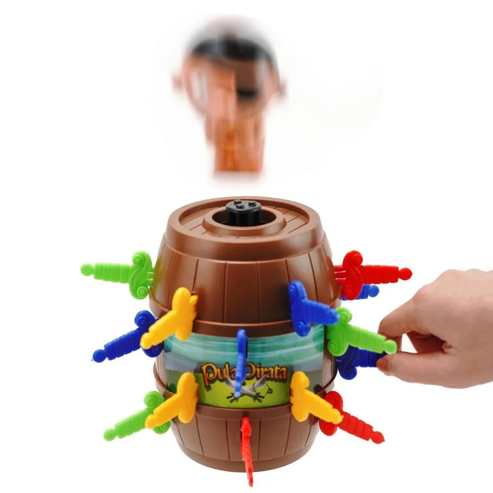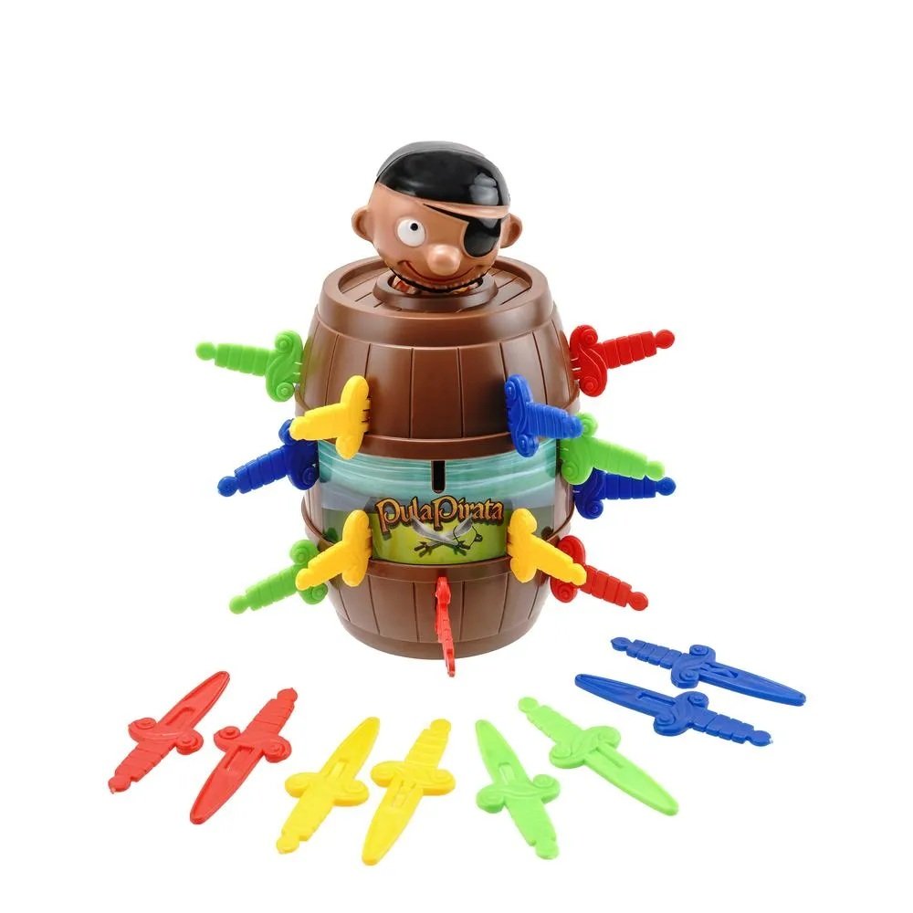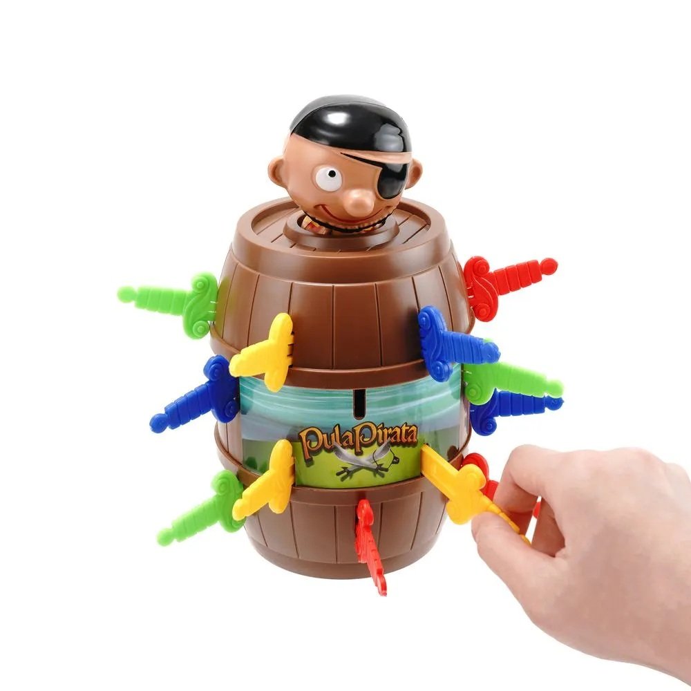 Uma espadinha aqui... outra ali... E de repente o pirata pula fora do barril! Espete o barril com cuidado, porque ninguém sabe quando ele vai pular!