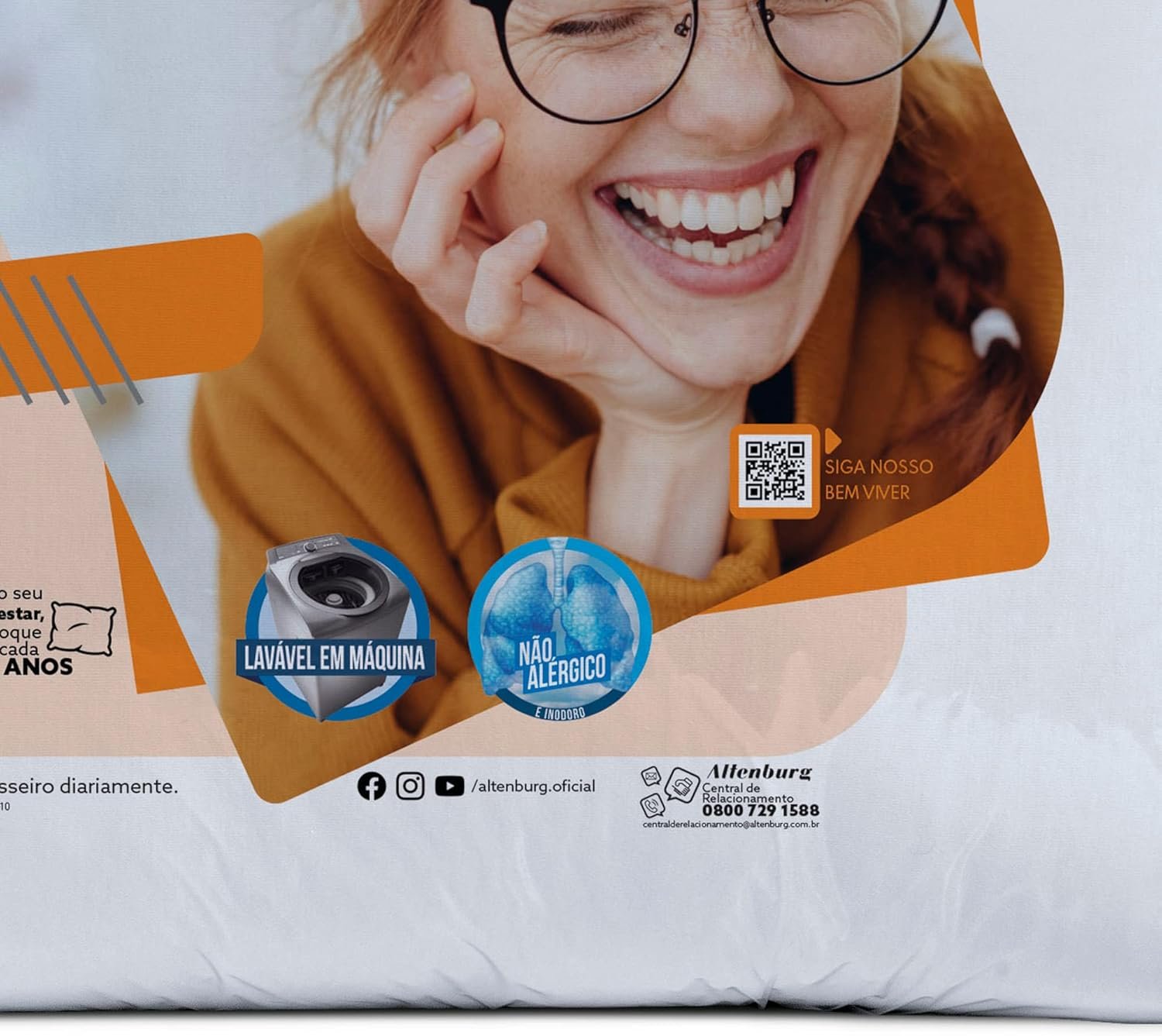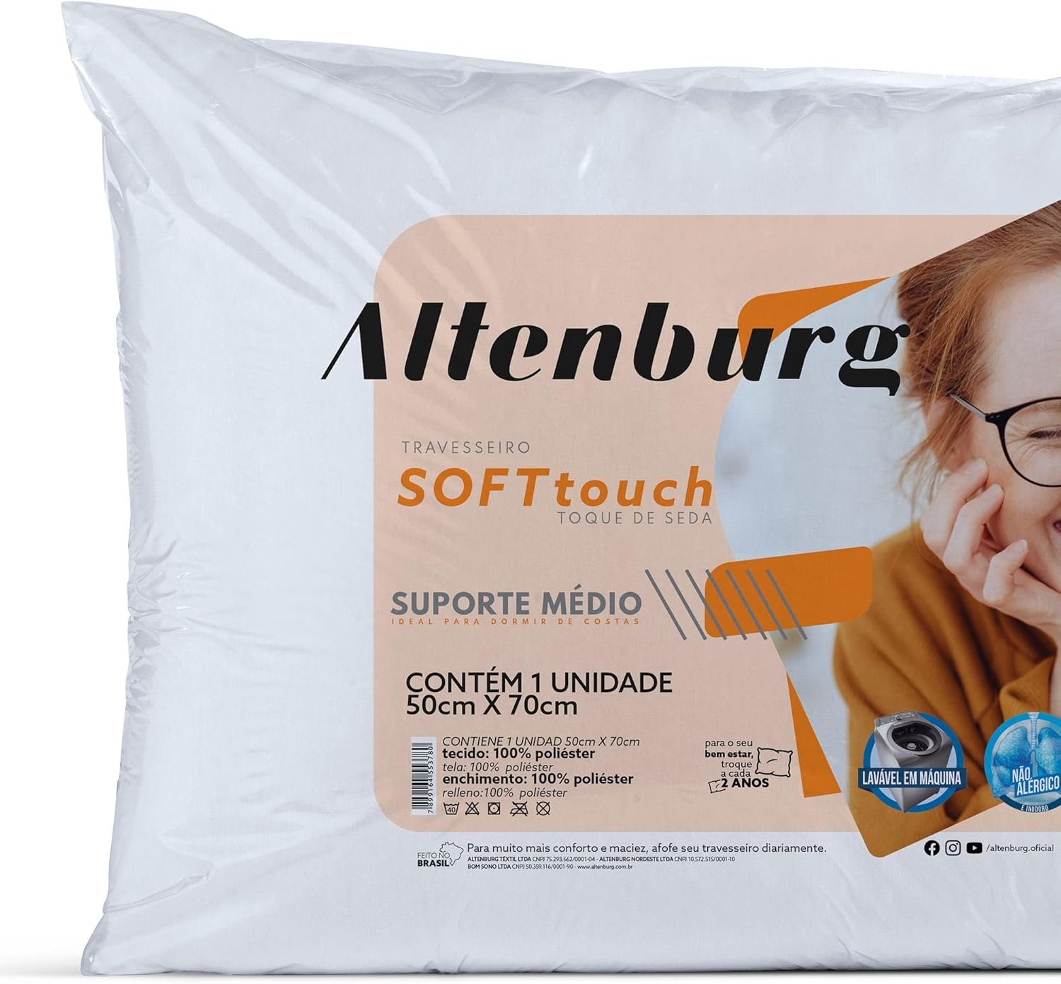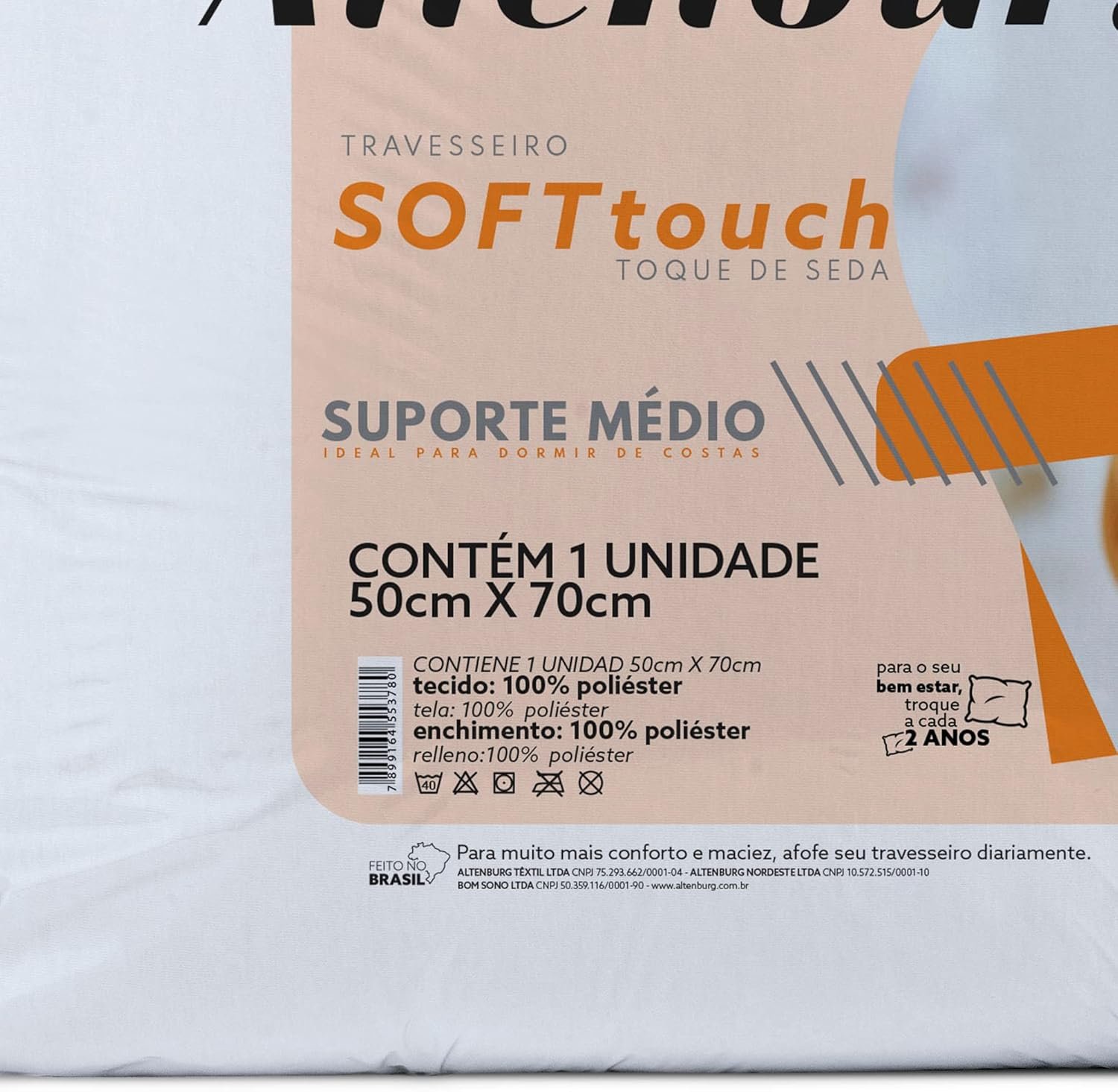 Especificações do Produto Tecido 100% Poliéster Diferencial Toque de seda Quantidade 1 Travesseiro Tamanho 50cm x 70cm Instruções de cuidado Processo normal temperatura máxima de lavagem 40°C. Não alvejar. Secagem em tambor temperatura baixa máximo 60°C. Não Passar. Não limpar a seco.