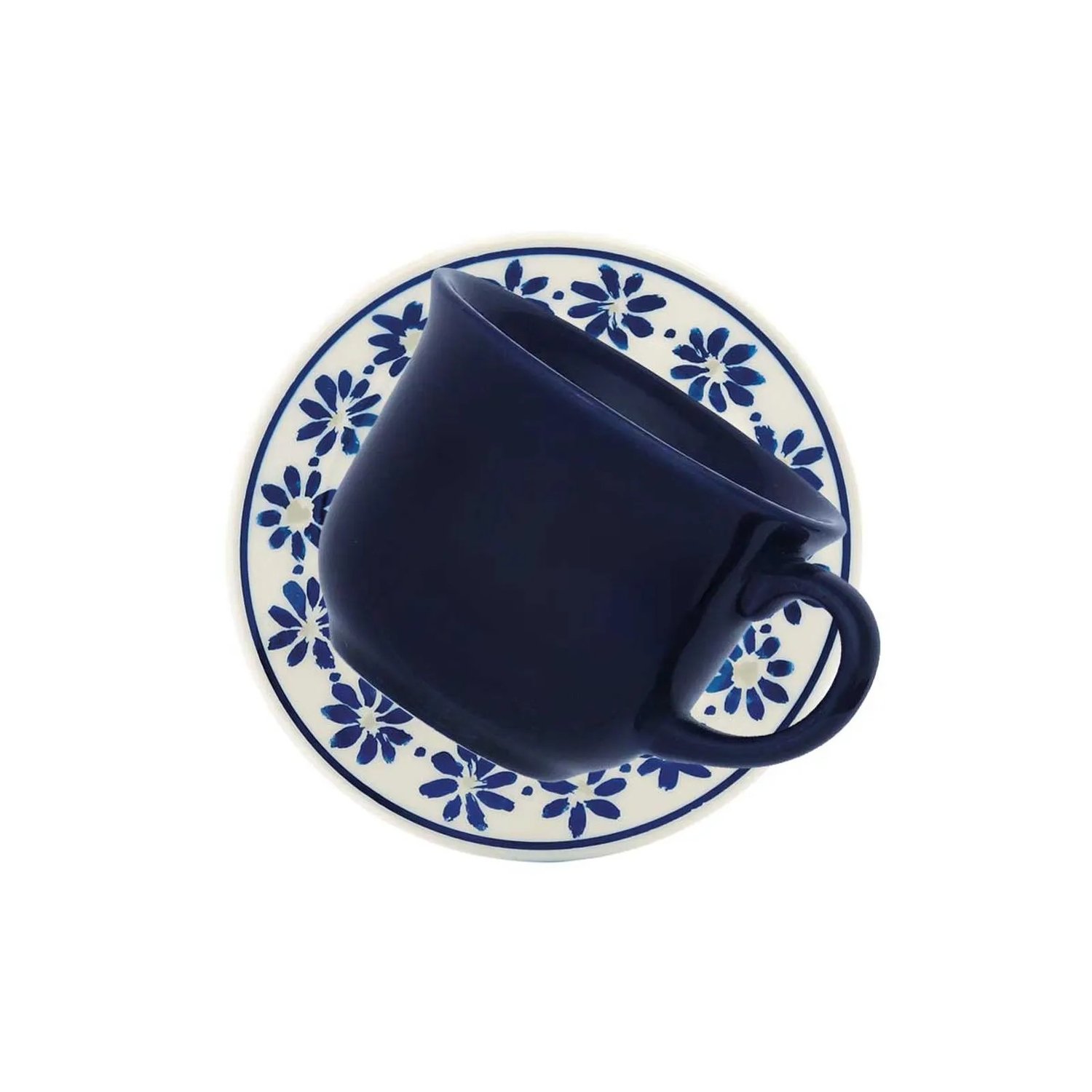 Informações Adicionais Quantidade 1 Peça (Xícara e Pires) Uso Resistente a micro-ondas, Resistente a lava-louças Material Cerâmica Formato Redondo Decoração Estampado Cor Azul escuro, Off white Capacidade 1 Xícara de Chá 200 ml (capacidade), 1 Pires de Chá 14 cm (diâmetro).